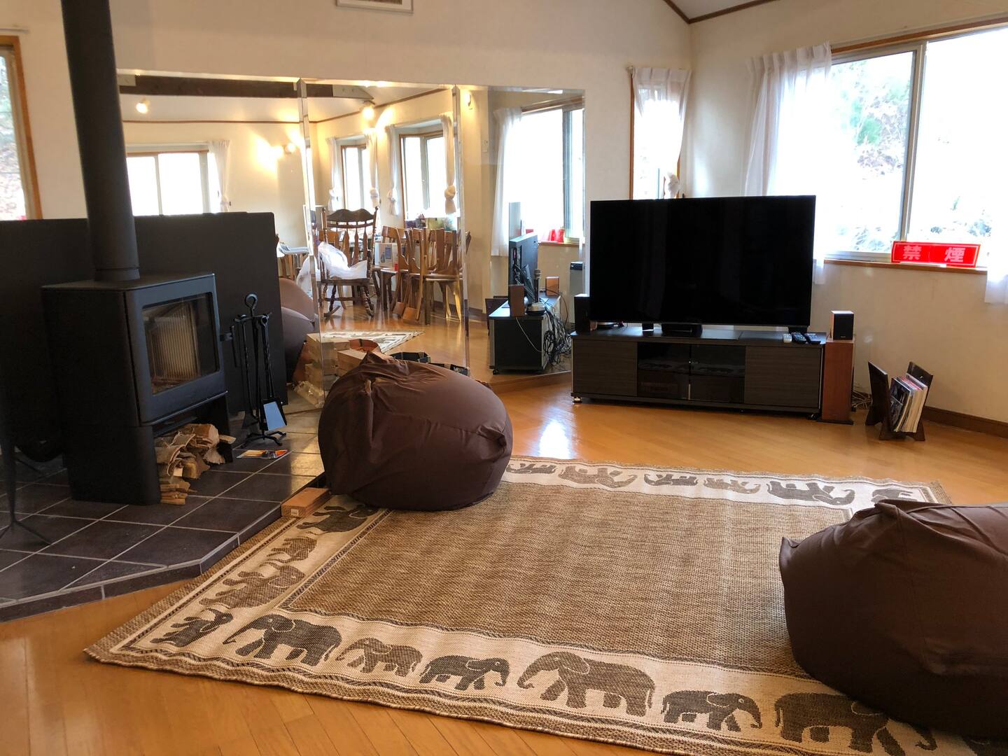 当施設自慢の「大型薪ストーブ」と「55インチの大型テレビ」がリビングルームにあります。薪ストーブの前で人間をダメにする大型ビーズクッションに寝そべって、BBCやNetflixが楽しめます。まるで田舎の実家に帰ったような雰囲気です。